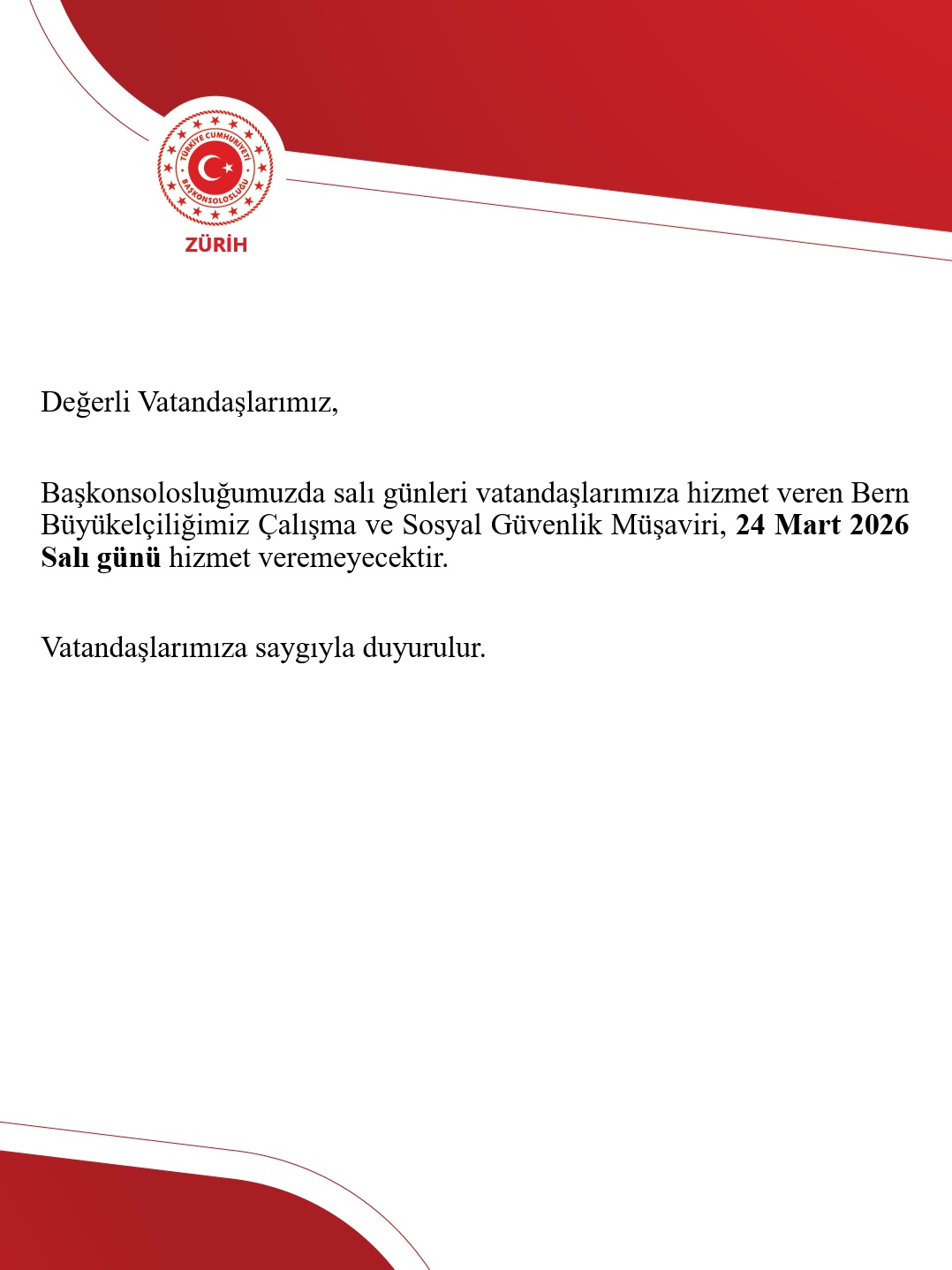 Başkonsolosluğumuzda salı günleri vatandaşlarımıza hizmet veren Bern Büyükelçiliğimiz Çalışma ve Sosyal Güvenlik Müşaviri, 24Mart 2026 Salı günü hizmet veremeyecektir.